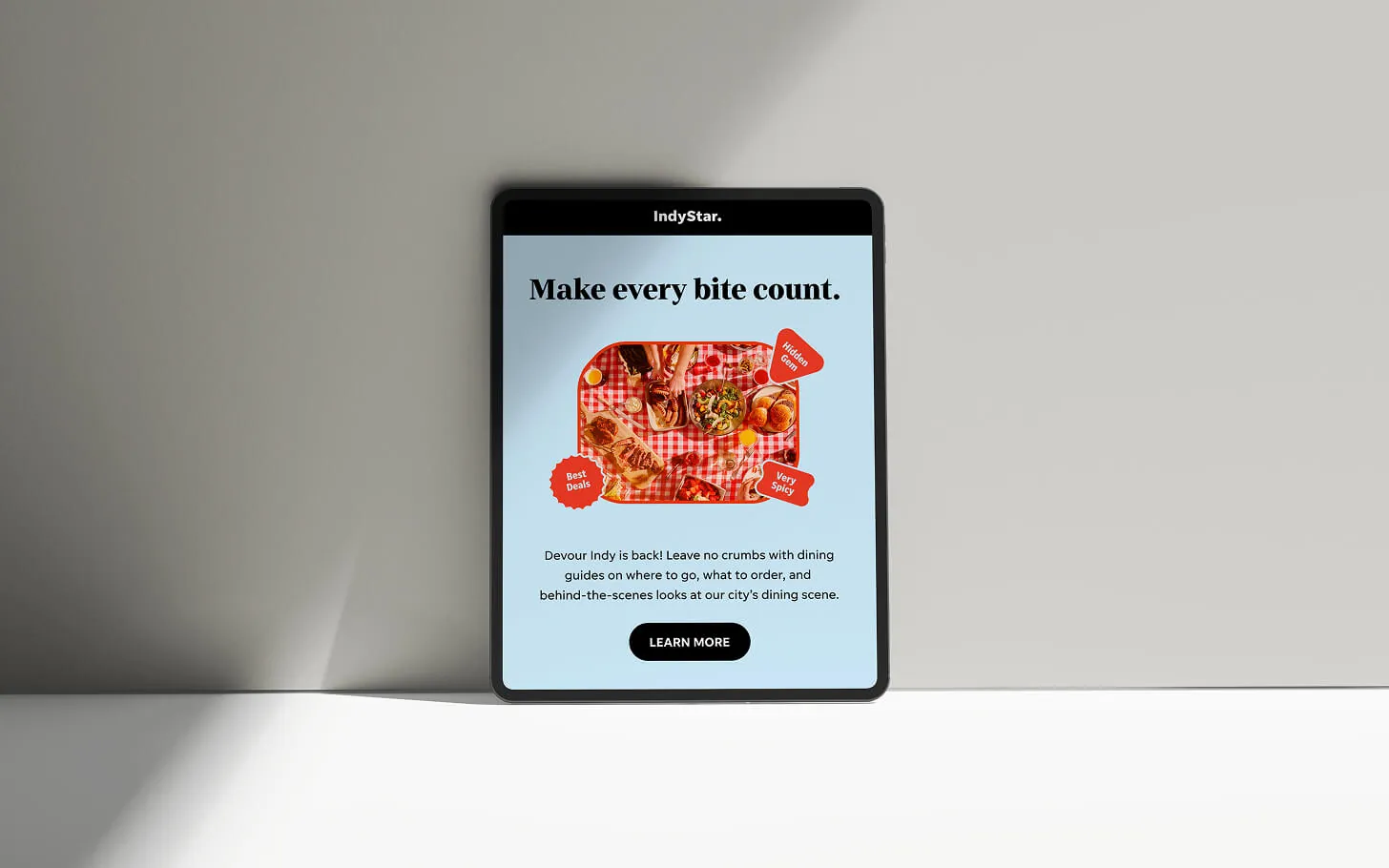 A bi-annual culinary celebration in Indianapolis, Devour Indy features dozens of restaurants with exclusive menus and pricing. Partnering with our Creative Director and Marketing Director, I led art direction from concept to execution — creating a vibrant look rolled out across the app, social media, print, and on-site event assets.