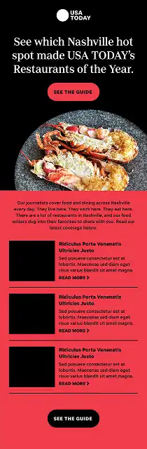 A vibrant series of 20 emails I art directed and designed for USA Today, celebrating the best restaurants of the year across the U.S. Each email creatively incorporated local color palettes and playful layouts, using dynamic photo collages to spotlight the rich flavors and visual appeal of each dining experience.