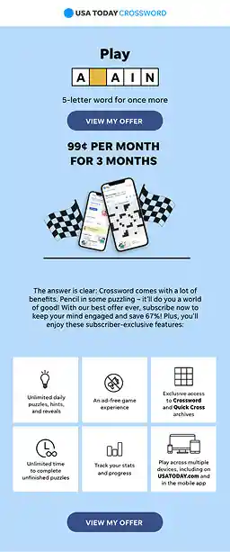 A subscriber engagement campaign delivering weekly crossword-themed emails with a playful, game-forward approach. As Art Director, I helped shape the concept and design, integrating animated crossword elements into headlines to create a more interactive and entertaining experience.